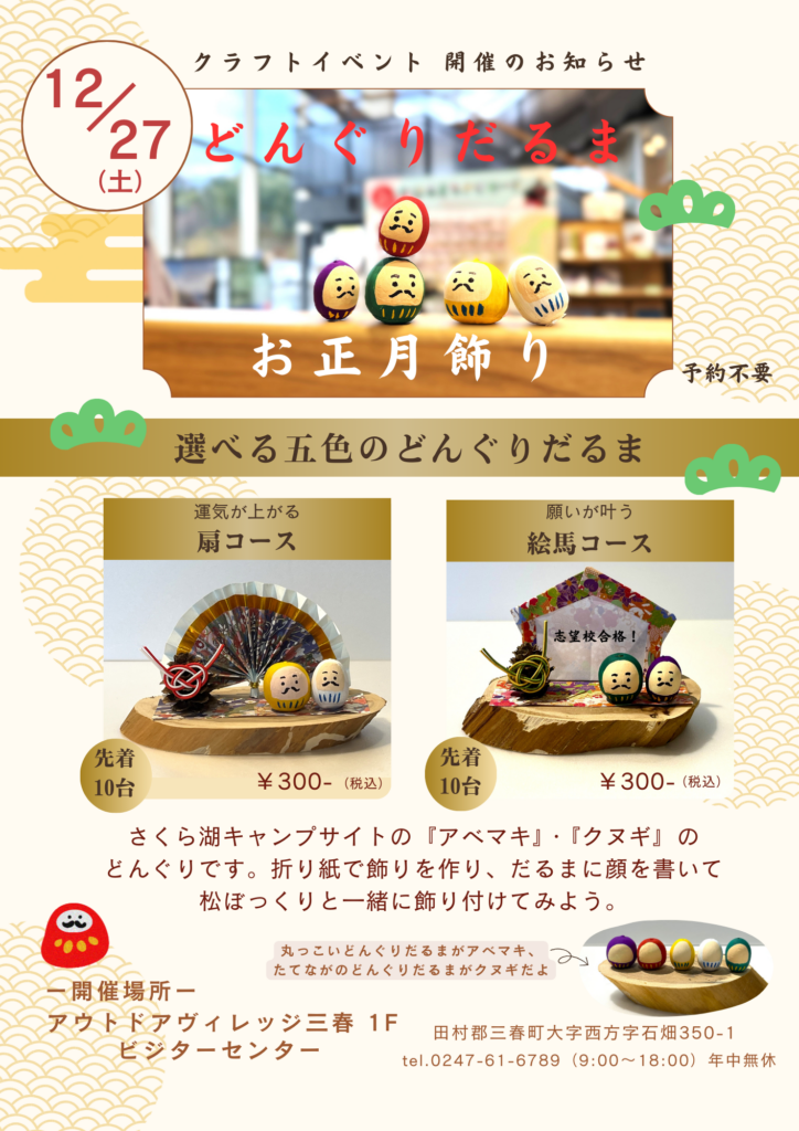 さくら湖キャンプサイトで生まれ育ったどんぐりを使って、「どんぐりだるま」のお正月飾りを作ります。
